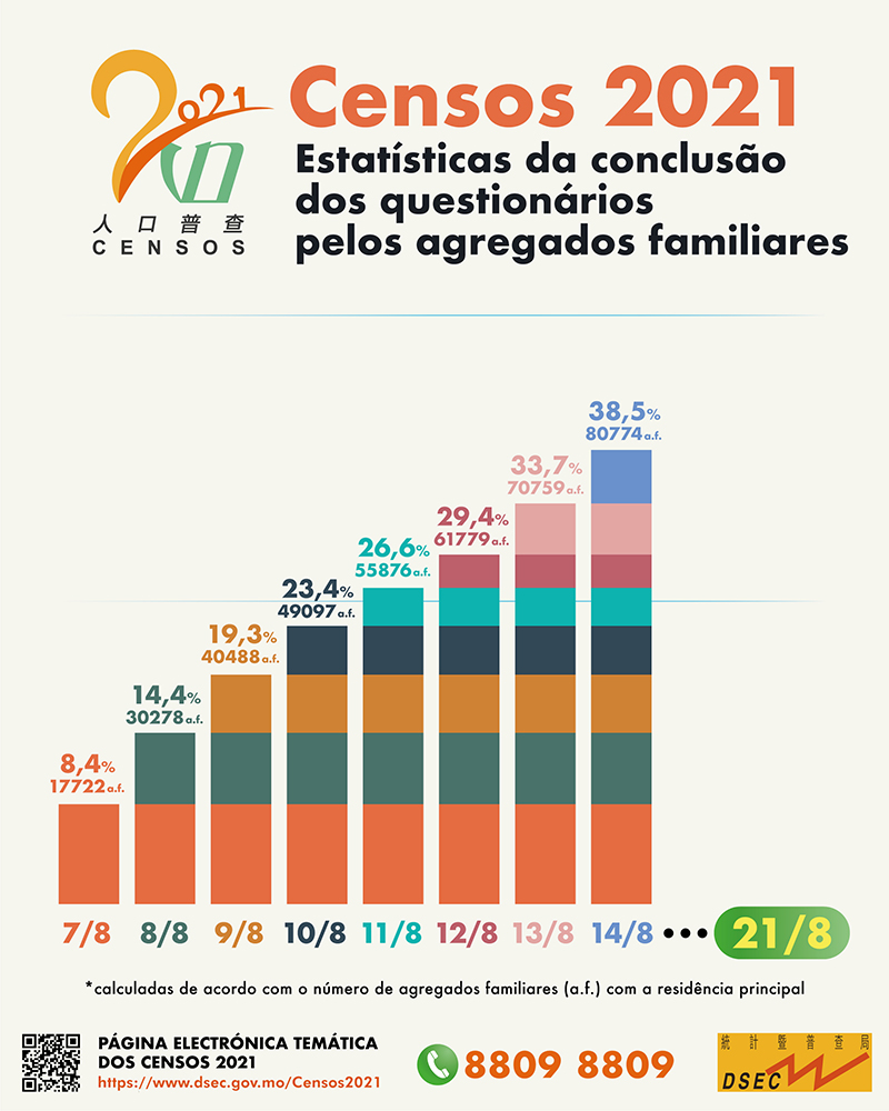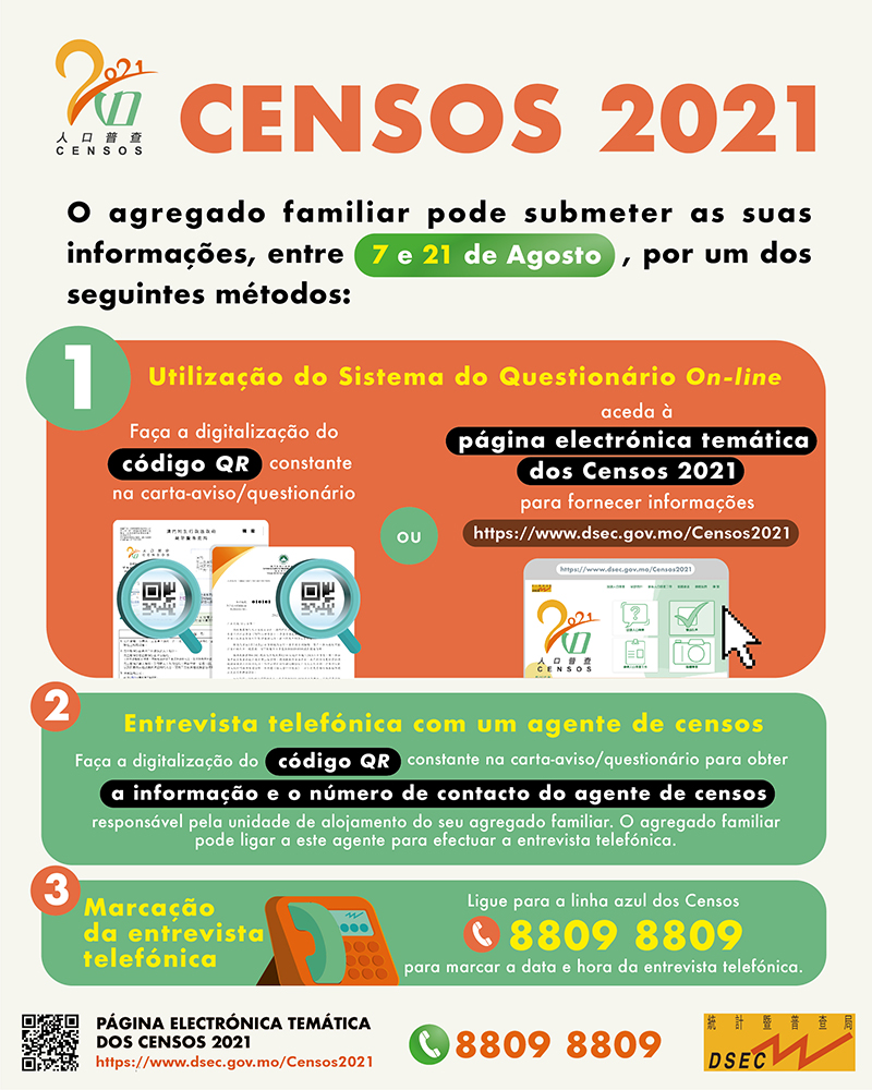 Os resultados dos Censos não só reflectem a evolução da estrutura demográfica de Macau e das respectivas características socioeconómicas, como também são referências relevantes para o planeamento do futuro da RAEM. A DSEC apela a todos os cidadãos de Macau que colaborem com a realização dos Censos e forneçam informações com a maior brevidade possível. Os agregados familiares que responderem ao questionário ficam automaticamente habilitados ao sorteio “Preenchimento colaborante: quanto mais cedo responder, mais oportunidades vai ter”. Para mais pormenores sobre os Censos, queira aceder à página electrónica temática dos Censos 2021: https://www.dsec.gov.mo/Censos2021, ou ligar para a linha azul dos Censos 8809 8809.