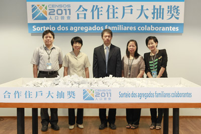 Data collection for 2011 Census has successfully concluded. As a token of appreciation from the Statistics and Census Service (DSEC), upon completion of the Census questionnaire, the households were automatically entered into the Cooperating Households Lucky Draw. The draw was held on 14 October, conducted by Ieong Meng Chao, Acting Director of DSEC, Cheng I Wan, Deputy Director, and other DSEC officials. A total of 53 winning households are announced as follows: